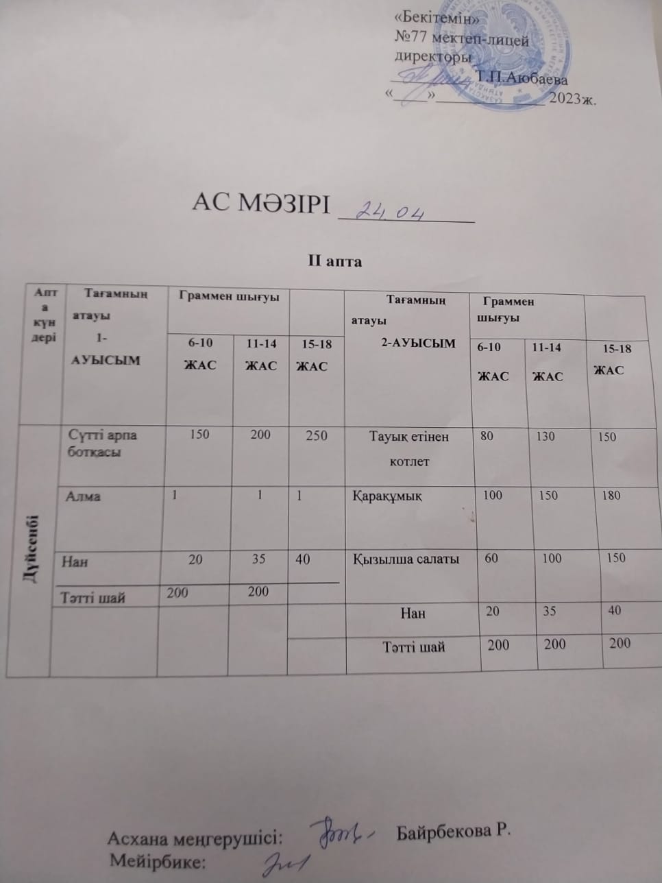 БІР КҮНДІК АС МӘЗІРІ