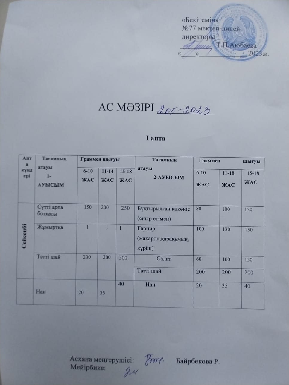 БІР КҮНДІК АС МӘЗІРІ
