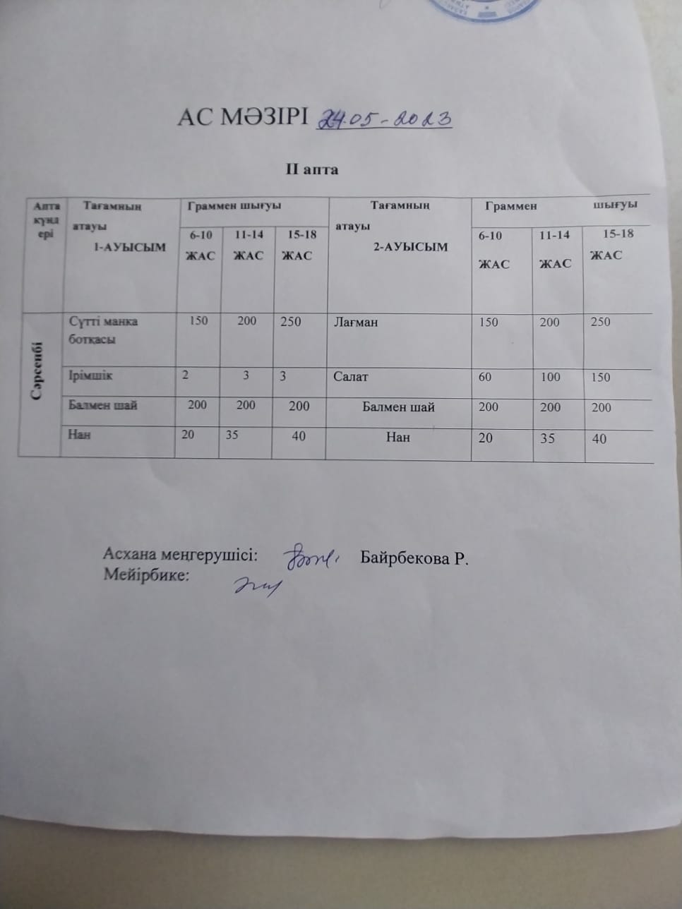 БІР КҮНДІК АС МӘЗІРІ