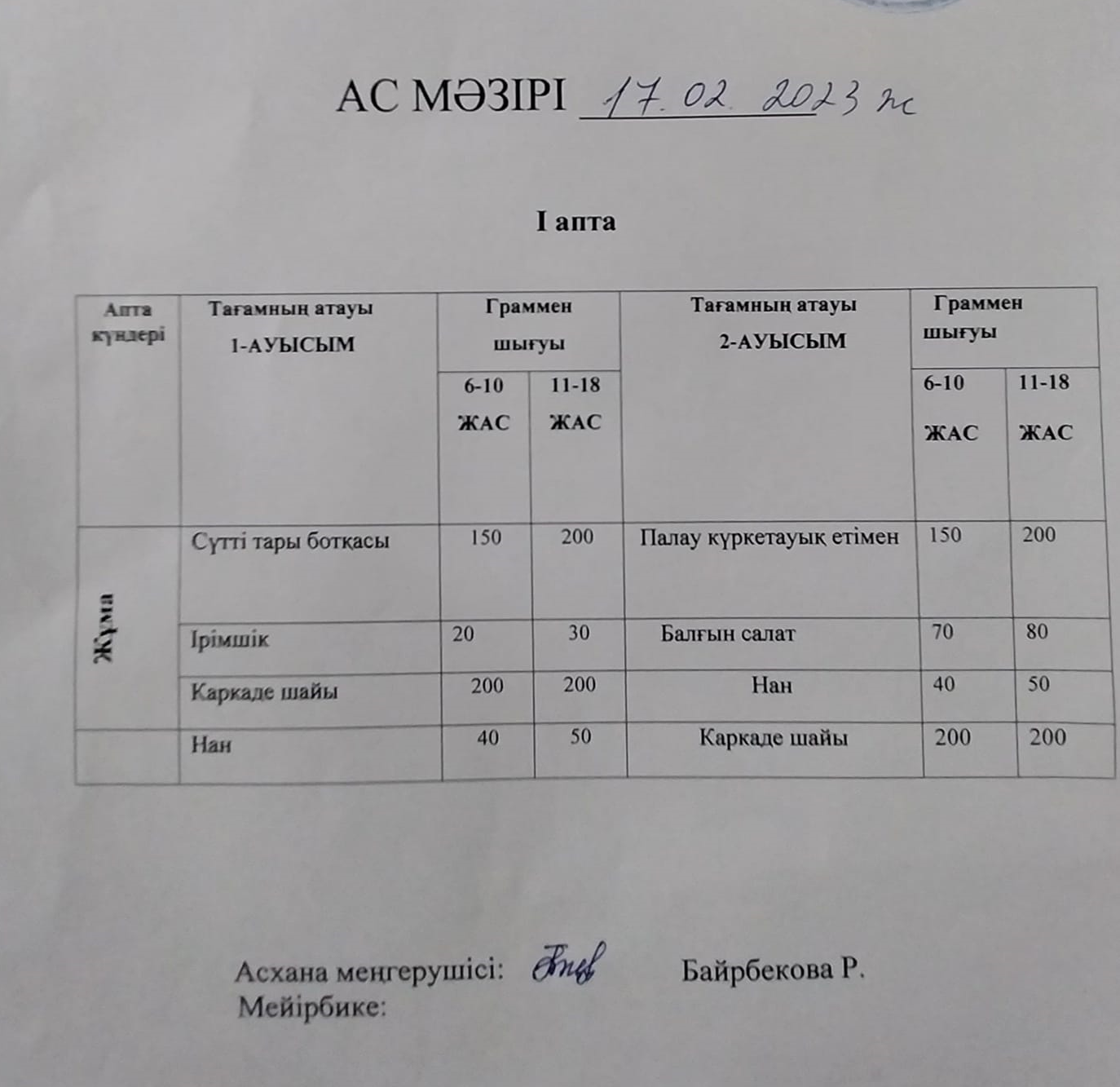 Салауатты өмір салтын қалыптастыру үшін күнделікті ішетін асымыз құнарлы, пайдалы, дәруменге бай тағам болуы керек. Осыған орай, Шымкент қаласы білім басқармасына қарасты А. Асқаров атындағы №77 мектеп - лицей асханасы құнарлы да пайдалы тағамдарды ұсынуда. Бір күндік ас мәзірі.